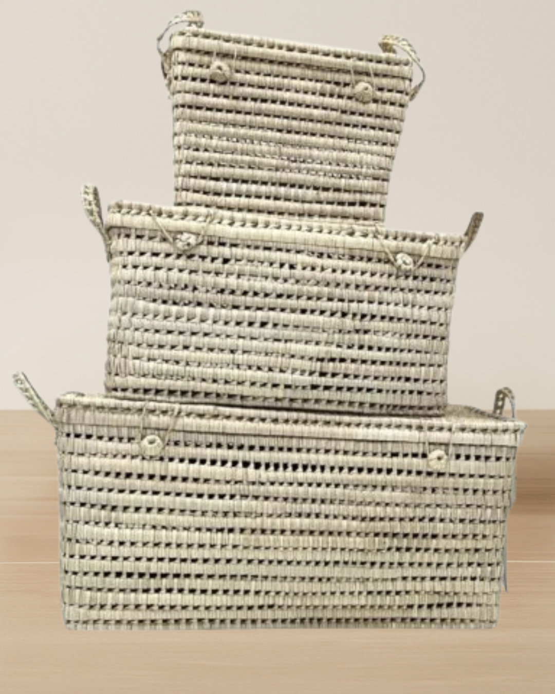 Chaque malle est équipée de deux boutons d’accroche sur le devant ainsi que de deux anses sur les côtés. Cela facilite leur manipulation et leur transport. Vous pouvez facilement déplacer ces malles selon vos besoins, que ce soit pour ranger du linge, des jouets ou des objets volumineux. Leur style intemporel s’adapte parfaitement à différents univers déco : bohème, classique ou contemporain.