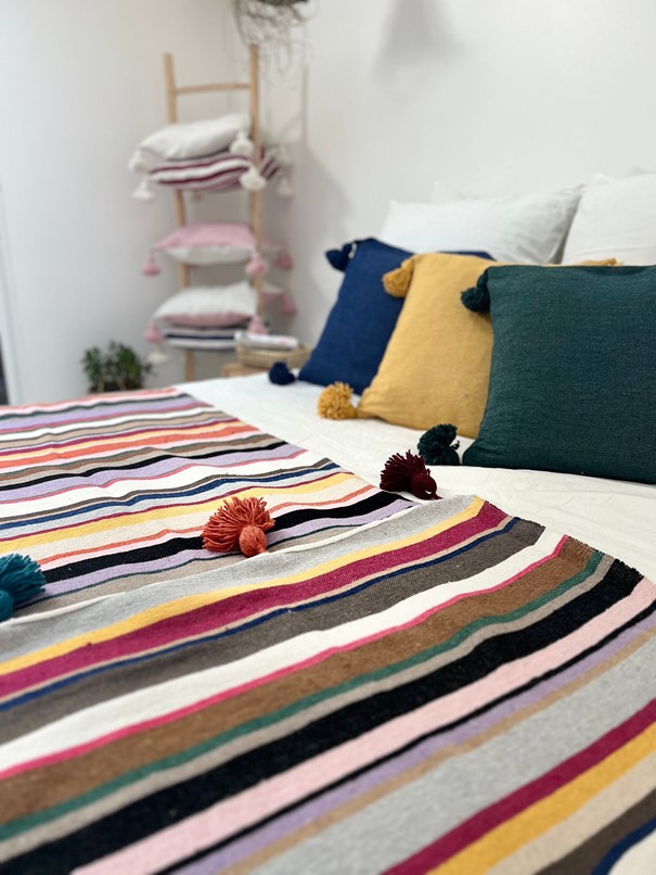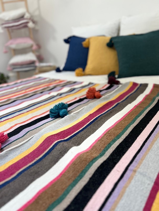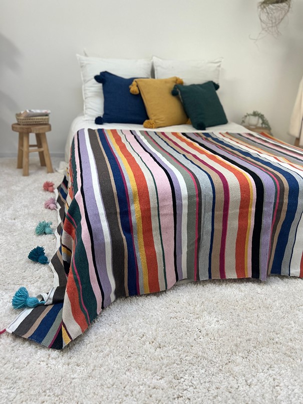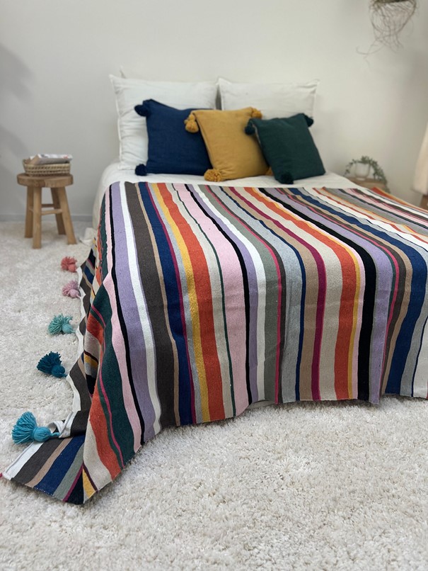 Chaque plaid tissé main est réalisé avec du coton 100 % naturel, garantissant douceur et confort. Ce savoir-faire artisanal transmet l’authenticité et la tradition marocaine à travers un produit durable et esthétique. Le plaid est une pièce artisanale qui valorise le travail manuel et offre une vraie qualité. Sa fabrication manuelle assure que chaque plaid est unique et chargé d’histoire.