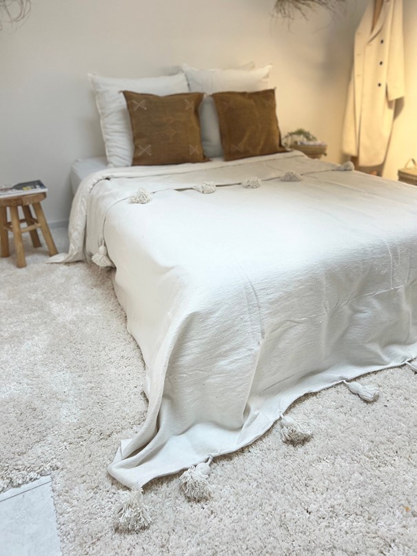 Ce plaid tissé main marocain est conçu avec 100 % de coton naturel. Ce matériau offre une douceur agréable tout en garantissant une bonne résistance. De plus, chaque plaid est unique, car le tissage à la main révèle un savoir-faire authentique et traditionnel. Ce travail artisanal apporte charme et caractère à votre espace.