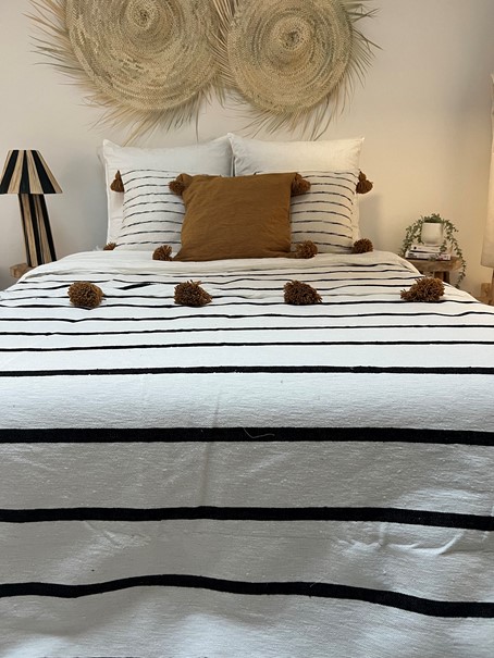 Avant tout, ce plaid est fabriqué avec du coton naturel de grande qualité. Cette matière garantit douceur et confort, tout en restant respirante. De plus, le tissage artisanal lui confère une texture unique, reconnaissable entre toutes. Grâce à ce savoir-faire traditionnel, chaque pièce est différente, avec des variations légères qui renforcent son authenticité.